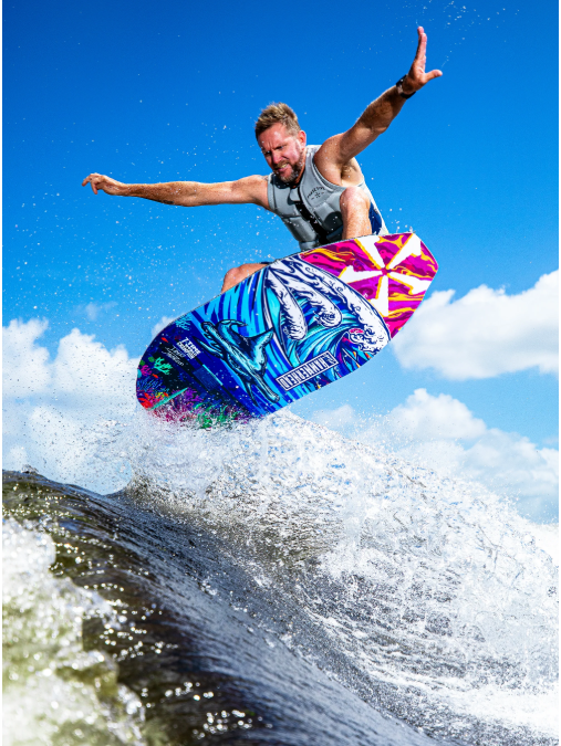 The Phase Five Hammerhead Wakesurfer is the king of revert. With a square nose and tail design, the Hammerhead delivers tons of speed and stability in both directions. Drew Danielo discovered that a traditional pulled in nose would struggle to ride backwards. This is where the Hammerhead triumphs. In addition, the peanut side rail design creates two contact points on the wave instead of one. This keeps the Hammerhead locked in and pointed down the line. The peanut outline adds surface area under each foot for increased maneuverability and speed than its predecessor. It features a full deck pad to take full advantage of riding revert and gives you the freedom to place your feet anywhere on the board!